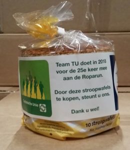 Een van de manieren om dit jaar Team TU te ondersteunen is door het kopen van overheerlijke stroopwafels. Vanaf woensdag 24 januari zullen er tijdelijk stroopwafels in het assortiment van TU zijn opgenomen. Een pakje (TU nr. 3618-288) van 10 stroopwafels kost € 2,50 en de opbrengsten gaan naar de Stichting Roparun.